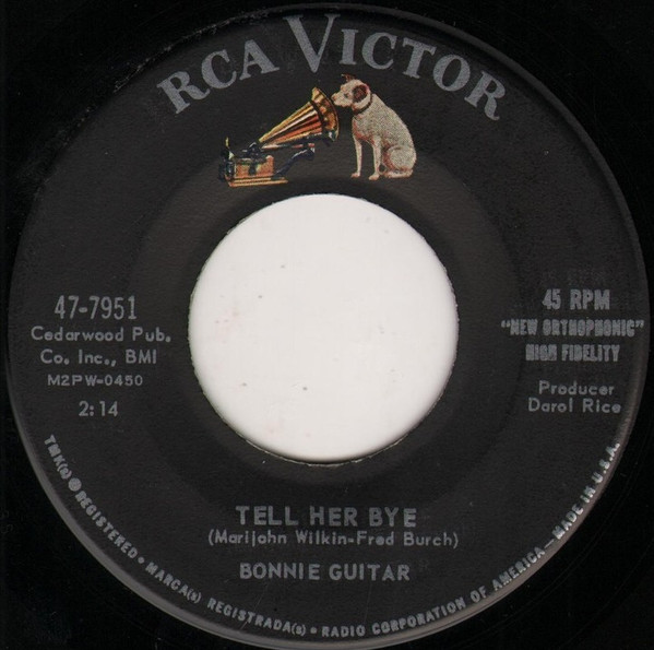 Bonnie Guitar - [1961] Tell Her Bye Track A. Tell Her Bye Written-By – Fred Burch, Marijohn Wilkin 2:14 B. I'll Step Down Written-By – Roy Bennett*, Sid Tepper 2:11 RCA Victor – 47-7951 / 7", 45 RPM, Single / Canada 1961 본명: Bonnie Tutmarc nèe Buckingham 1923년 3월 25일 워싱턴 주 시애틀에서 보니 버킹엄(Bonnie Buckingham)으로 태어난 보니 기타(Bonnie Guitar). 재능 있는 가수, 음악가, 프로듀서, 사업가인 그녀는 1957년 컨트리 ​​팝 크로스오버 히트곡 "Dark Moon..